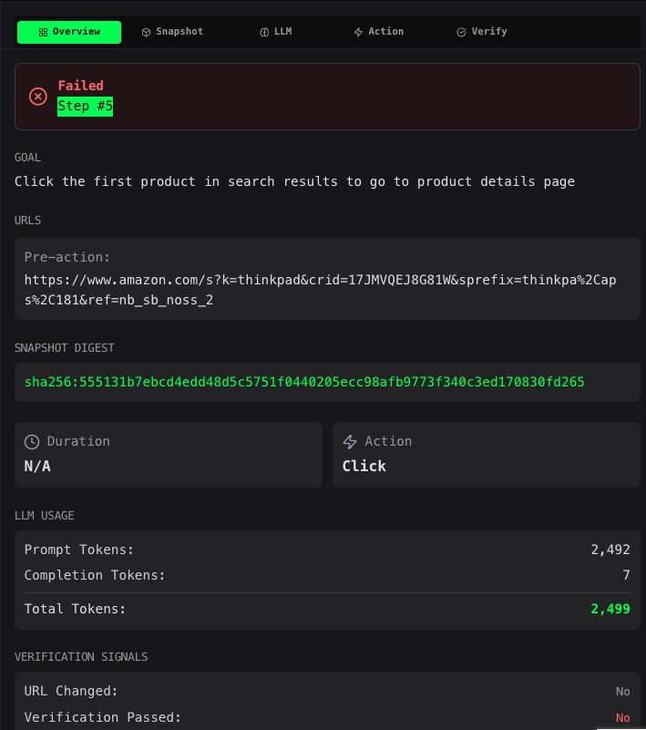 Steps passed: 7/7The practical point is not that the executor “understands Amazon.” It selects actions inside a loop that proves outcomes (via assertions) and forces the correct branch when intent is unambiguous (via deterministic overrides).