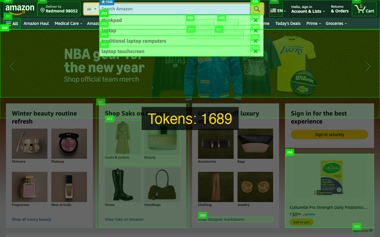 notes: token reduction ~43% (estimated ~35,000 → 19,956) via element filteringDemo 1 (Human steps + Qwen 2.5-3B executor):