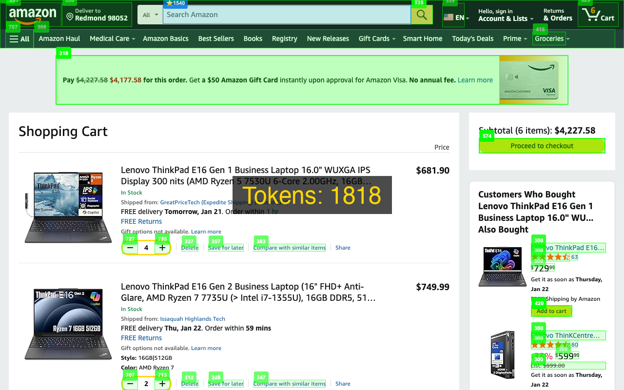 Task (constant across runs): Amazon → Search “thinkpad” → Click first product → Add to cart → Proceed to checkout