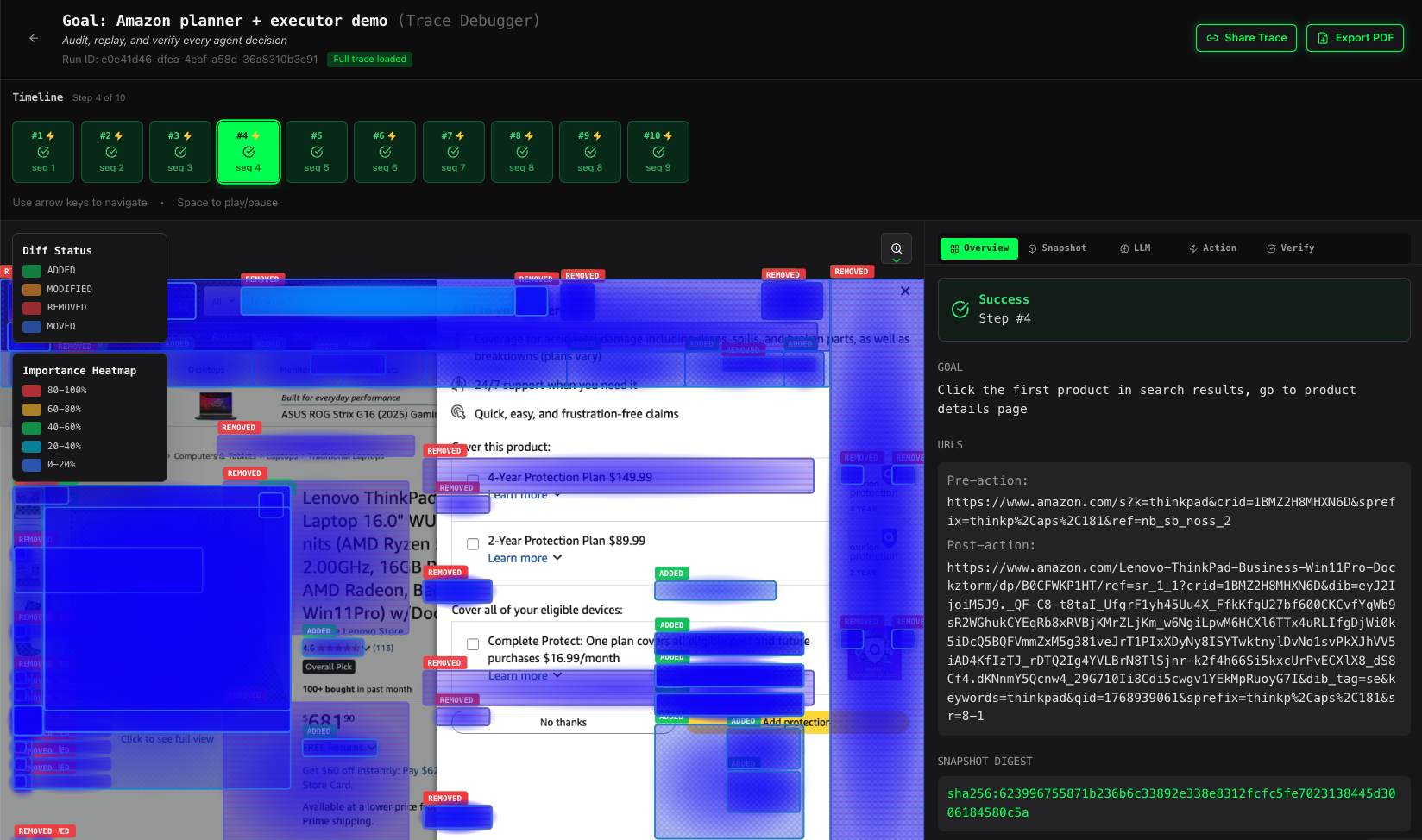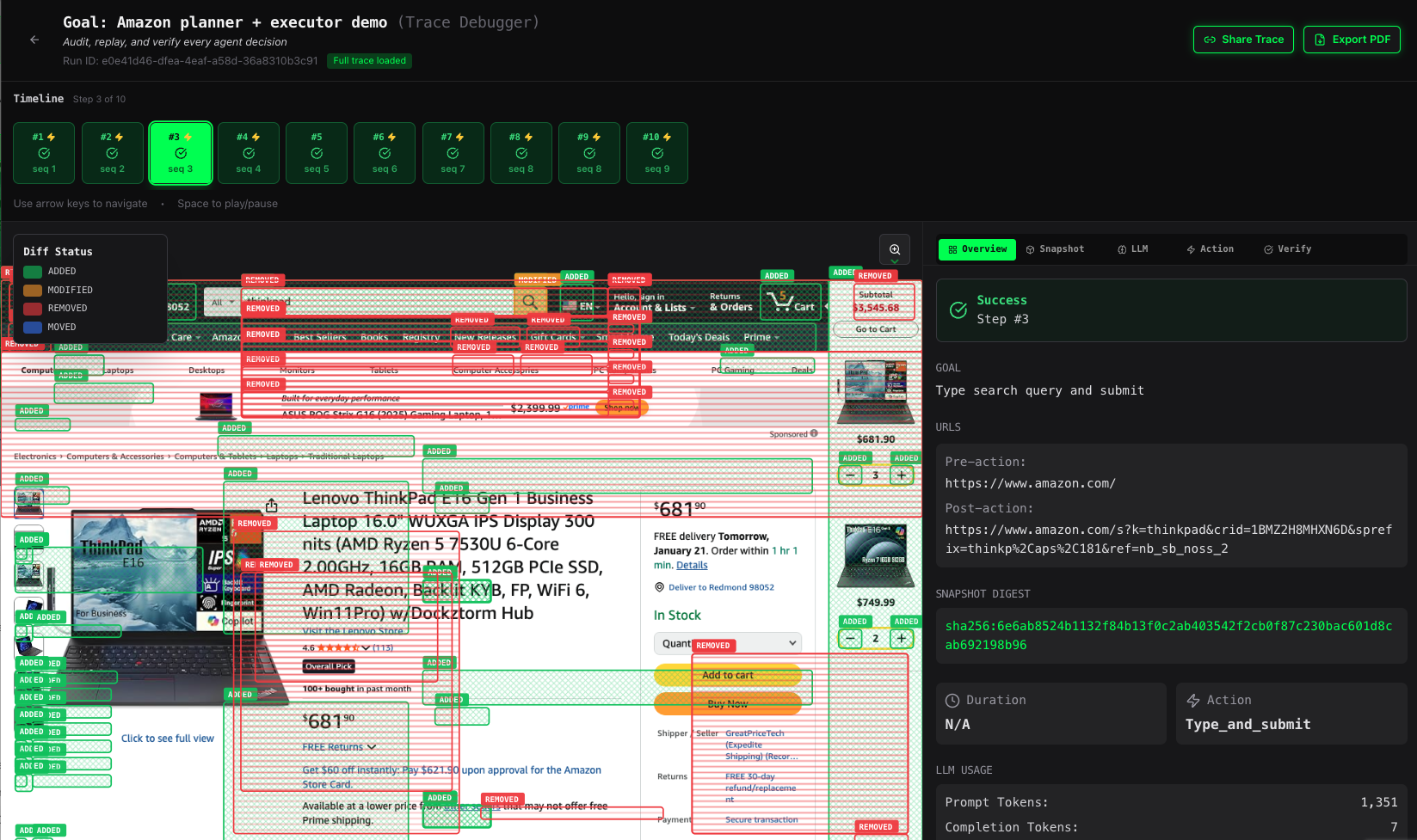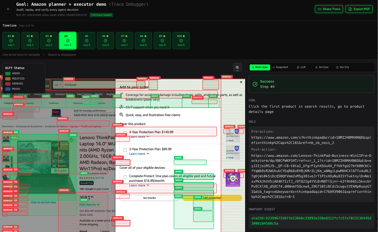 Amazon shopping flow snapshot diff status between 2 steps (shows whether the LLM action succeeded)
