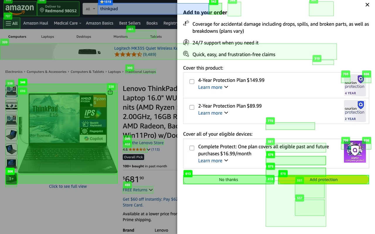 Task (constant across runs): Amazon → Search “thinkpad” → Click first product → Add to cart → Proceed to checkout